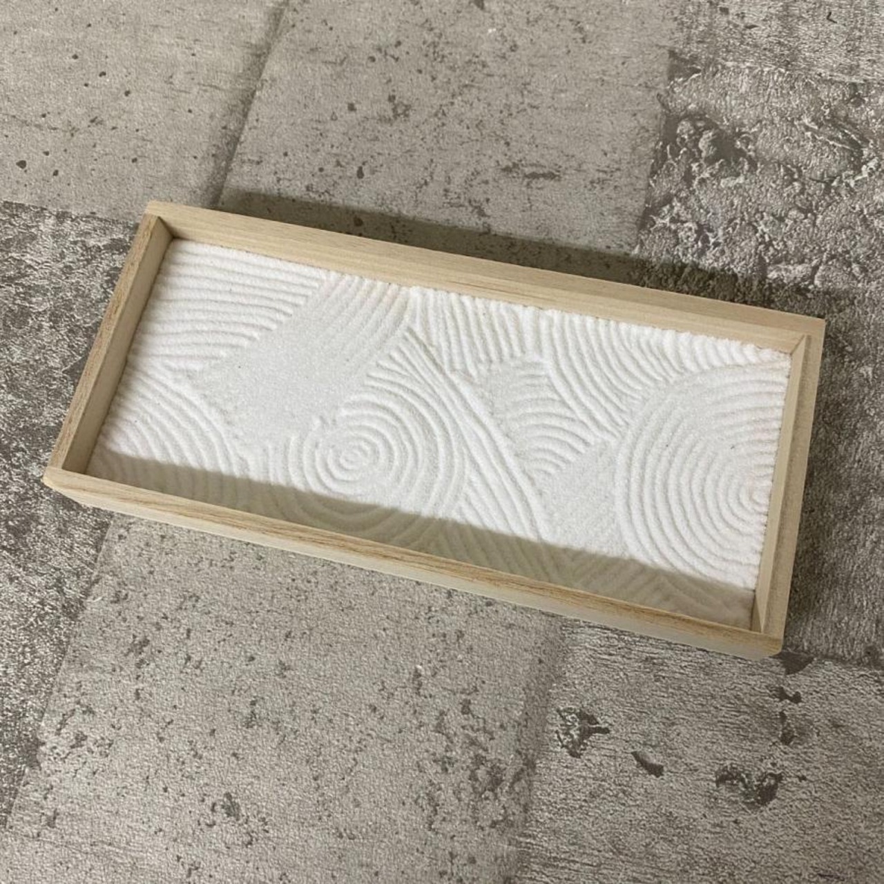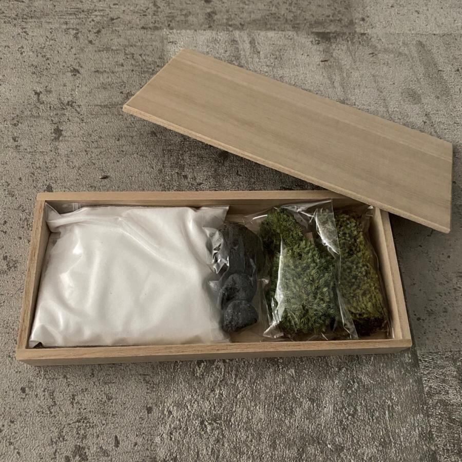 枯山水のセットになっておりますので、レーキ加(熊手)とスティックでお好きな水の模様を描き、心穏やかに石と苔を配置する作業を 無になってできるのも醍醐味です。