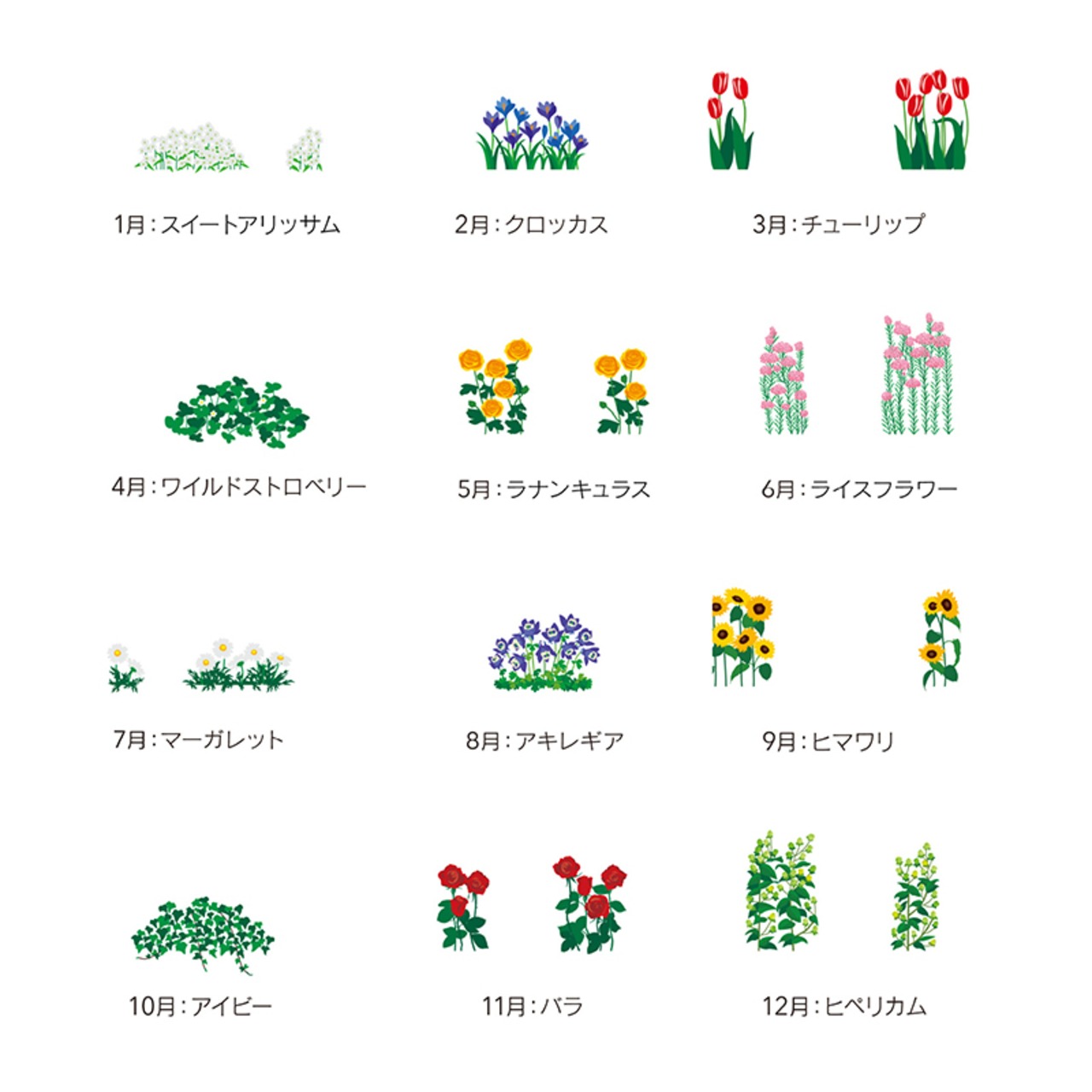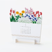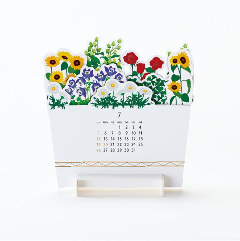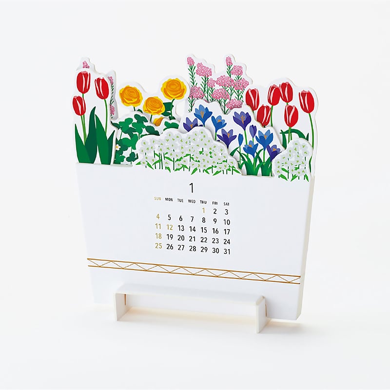 季節の花々をアレンジした寄せ植えをデザインモチーフにしたカレンダーです。6枚のシートを1月から6月の順に重ねて台座にセットします。月が終わったら裏返して一番後ろにまわします。