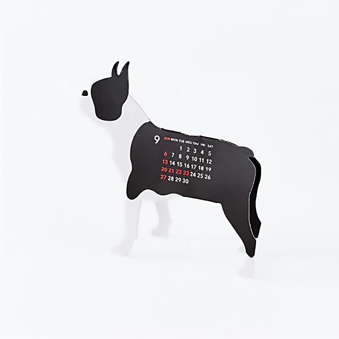 のりやハサミなどを使わずに、簡単に組み立てることができるペーパークラフトカレンダーです。6枚のシートがセットされており、パーツを取り外して組み立てると、犬のかたちをした2カ月表記のカレンダーになります。