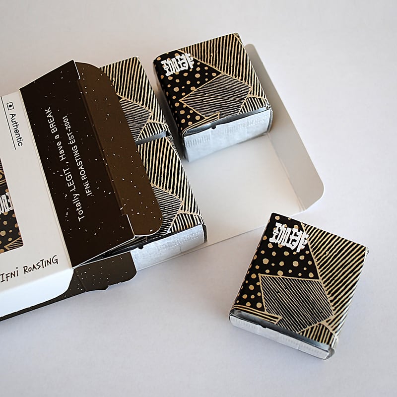 個包装紙のテキスタイルや”珈琲羊羹”の文字などは静岡出身の人間国宝/芹沢銈介氏の技法を受け継いだ1人、高井信之氏とイフニが共同製作したものです。