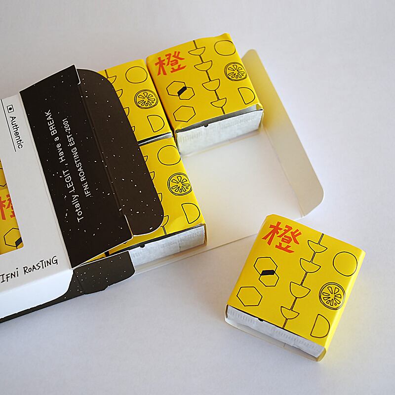 個包装紙のテキスタイルや”珈琲羊羹”の文字などは静岡出身の人間国宝/芹沢銈介氏の技法を受け継いだ1人、高井信之氏とイフニが共同製作したものです。